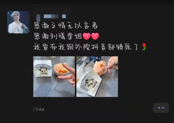 随后,潘越同学也在朋友圈表达了对刘瑶学姐的感谢和对抖音制作部的热爱。由此可见公司员工干部对其干事的深切关怀,干事与部长之间关系密切,氛围十分融洽,也让公司团学组织成员对自己的部门感到了归属感。