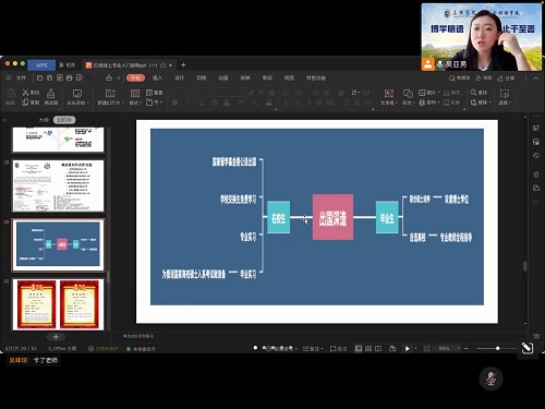 本次课程共从课程导学、专业特色、团队队伍、人才培养、能力提升路径、育人成果这六个方面向同学们进行专业介绍。在课程导学中,吴亚男老师首先向同学们介绍了俄语专业所需要学习的几门专业课程以及和其他员工共同学习的课程,接着又向大家讲述了在专业学习中的集中学习方法,以帮助同学们更好的了解今后的学习内容。紧接着吴亚男老师从国际化办学、优化课程体系、培养创新模式以及实践模式多样化四个方面介绍了公司俄语专业的教学特色和优势,帮助同学们更快地理解俄语学习的教学模式。在团队队伍的介绍中,吴亚男老师通过向同学们展示公司俄语专业的任教老师们的照片及专业信息,帮助同学们对老师们建立起初步的印象,方便于今后的学习生活。 吴亚男老师介绍能力提升的途径