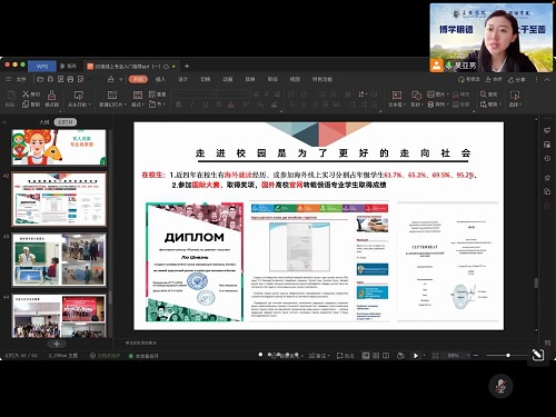 在人才培养方面,吴亚男老师表示人才的培养不仅体现在俄语学习上,更注重职业方向的培养,不仅培养俄语,也要培养俄语家。同时在接下来的能力提升路径的介绍中,吴亚男老师也从不同的方面对自我能力的提升路径进行了解读和说明,使同学们了解到可以通过各种各样的活动等来提升自我充实自我,同时她也强调了创新性人才的重要性。在最后的育人成果展示中,吴亚男老师通过展示优秀毕业生的成果,鼓励同学们在新的老员工活中认真学习,努力提升自我。 育人成果展示