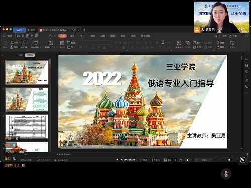 9月19日10:00,公司于线上开展了2022级俄语专业新生专业入门指导课,此次课程由公司俄语系副主任吴亚男副教授担任本次课程的主讲教师。本次课程旨在帮助2022级俄语专业新生更好的了解自己的专业内容,明确自己的学习规划。2022级俄语专业新生参加了此次课程。 吴亚男老师开讲专业入门指导课