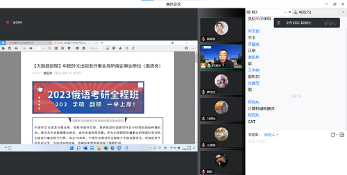 为了增加大一新生对专业方向选择的了解,提高学习核心专业课的动力,公司于9月26日8:00用腾讯会议开展了俄语专业入门指导教育课,由程海东老师担任主讲教师,公司2022级俄语专业的同学参加。