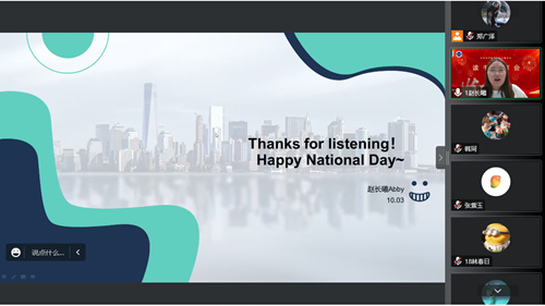为庆祝中华人民共和国成立73周年和更好的让同学们了解经典名著,yl6809永利官网举办了迎国庆读经典读书分享会,10月3日14:10,公司通过腾讯会议线上组织了关于经典名著阅读的分享会,团委副书记袁威老师、员工会主席韩珂及员工组织培养人参加,员工组织培养人张紫玉做主持人,通过前期发起、收集、筛选等,有27名同学进入最终分享。