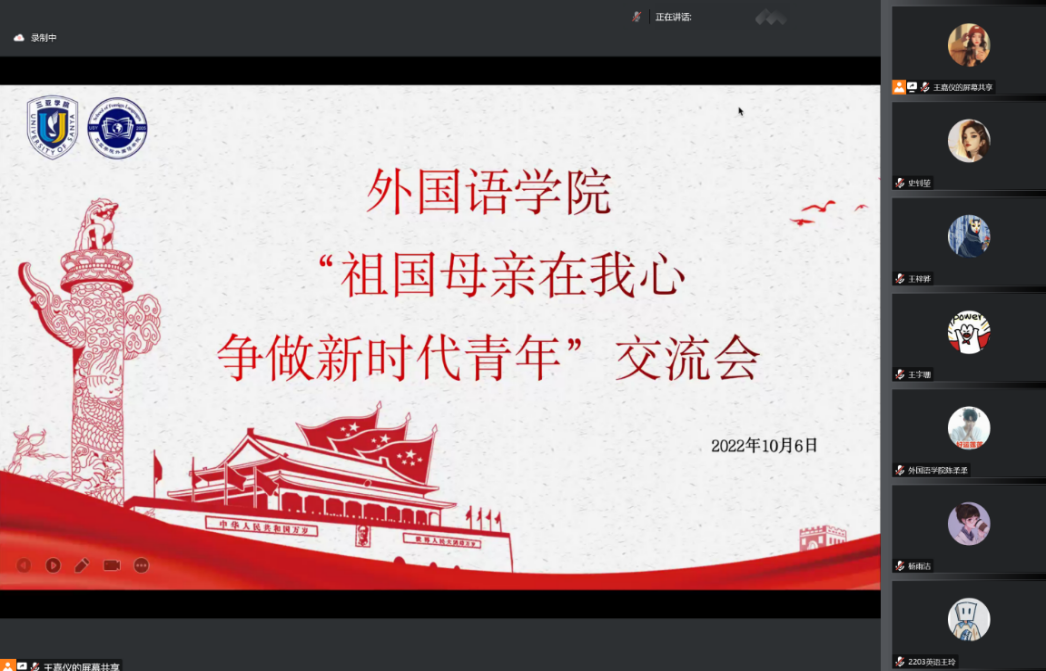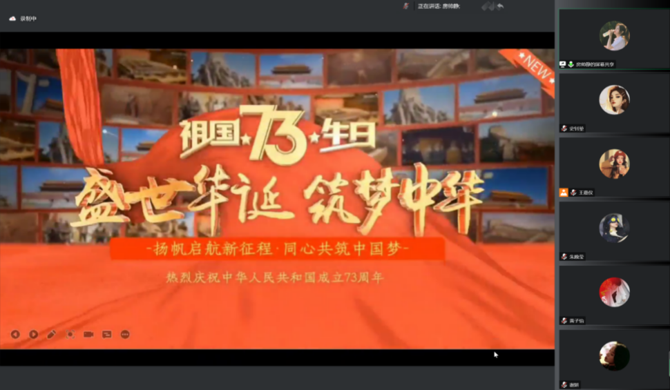 参加本次交流会的同学们用最真挚的情感讲述“祖国和我”的故事,用昂扬的斗志抒发自己的爱国之情,用最优美的语言赞美歌颂祖国母亲,用生动的视频展示了千百年来祖国母亲的变化,在祖国母亲73周年华诞之际献上最美的祝福。英语2201班房帅静同学通过视频和PPT的方式展示了祖国的发展与变化,她始终坚持自己的理想抱负,希望为祖国的发展做出属于自己的一份力量。