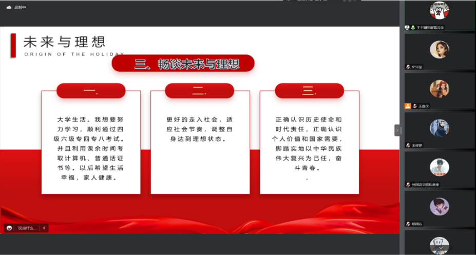 青衿之志,履践致远。在表达对祖国母亲的热爱与赞美之时同学们也展望未来表达自己的理想抱负。英语2202班王宇珊同学声情并茂的向我们展示了祖国的发展变化,同时为了更好的鞭策自己,并对自己的大学学业进行计划和安排。