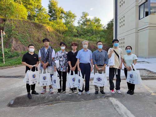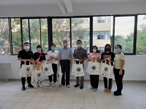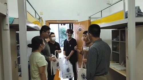为切实了解新生们解除网格化管理后回到自己宿舍后的生活和学习的情况,11月14日16:30,由公司李发元经理以及党总支副书记马炳琛老师带队,公司团委副书记袁威老师、思想导师王艳琴老师以及部分员工干部一同前去走访公司大一新生宿舍进行慰问活动,并为每一位新生准备了学院定制版的印有公司校徽、院徽及院训的帆布袋,帆布袋中含有员工手册、学习指南以及校徽等的新生礼包,在走访宿舍时送至每一位同学的手中。 合影