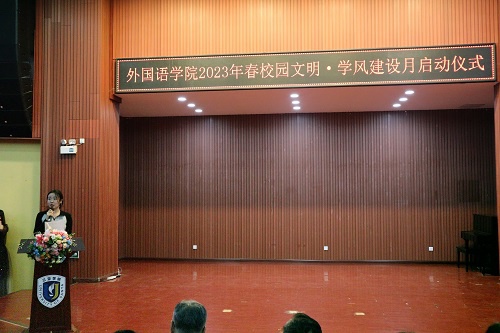 为创文明校园,建优良学风,3月9日14:00,公司于书会堂开展“yl6809永利官网2023年春学期校园文明•学风建设月”启动仪式,本次活动由刘泫孜担任主持人,公司经理李发元教授、公司党总支副书记马炳琛老师、院团委副书记袁威老师、英语专业副主任余玉秀副教授、俄语专业副主任吴亚男副教授、公共外语教学部副主任张晓辉教授、英语专业潘红老师、公共外语教学部陈蓉蓉老师、思想导师林玫老师、思想导师王艳琴老师、学业导师付鹃老师受邀出席了本次仪式,公司团学组织成员,大三各班班委、大四各班班级代表及大一大二全体同学参与了本次活动。 主持人讲话
