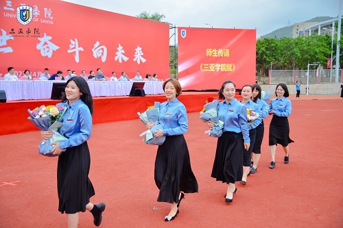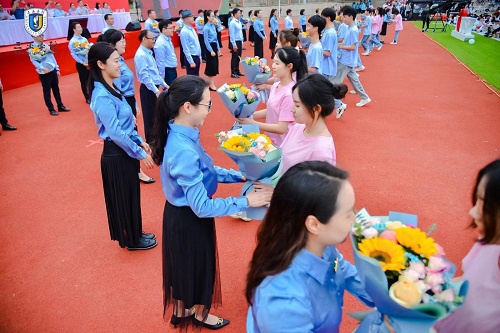 大会第六项是传承“大学的梦想”,员工代表为思想导师、教师代表献花,老为员工佩戴校徽,这项活动彰显公司的传承精神,全体师生传诵《永利集团赋》。 员工给教师献花