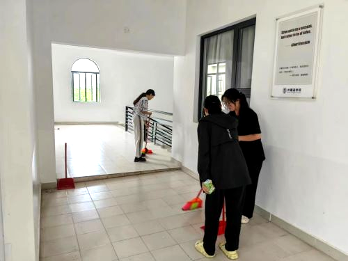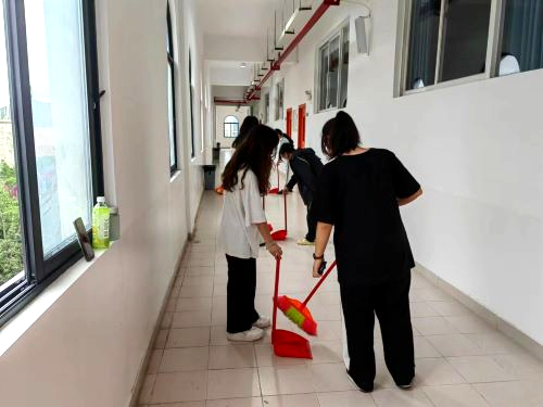 在公司员工干部们的带领下,同学们拿着劳动工具来到对应楼层开始打扫,扫地,拖地,他们迅速进入劳动状态。劳动过程中,对教学楼墙壁、地面、窗户及卫生死角进行“细致化”打扫。同学们相互配合,地面被打扫的干干干净净无纸屑无杂物垃圾。