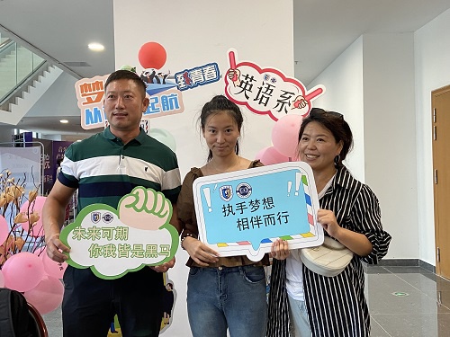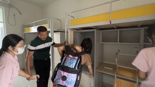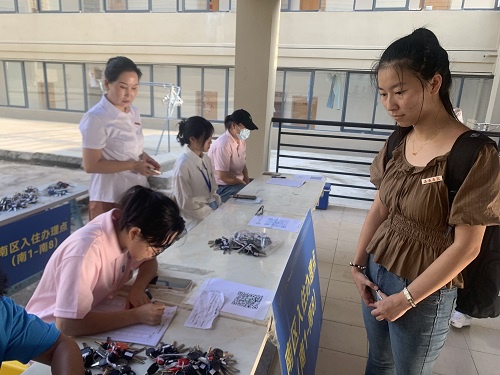 在完成了报到之后,公司党总支副书记马炳琛老师、院团委副书记王艳琴老师与公司第一位新生一同在背景板前合影留念,接着,马书记为公司第一位新生佩戴校徽以及赠送公司新生入学伴手礼,体现了公司的关心与关爱,让新生第一时间感受到公司的关怀。随后,负责引导的员工干部带领她从报到现场去南区宿舍处报到。