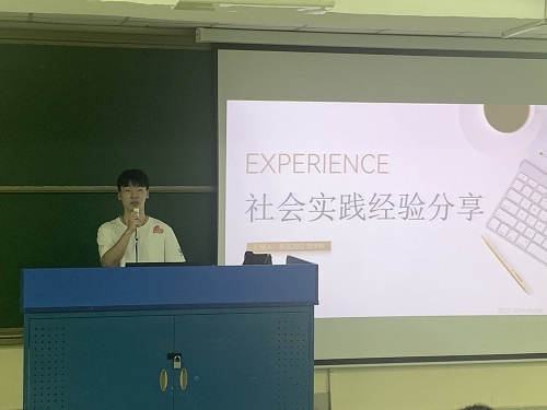 最后,英语2002陆子轩给2023级同学分享了他的社会实践经验,从大一开始的社会实践到博鳌亚洲论坛志愿者,他表示社会实践会带来许多经验,还有特别强调了参加社会实践活动的意义,他希望2023级同学跳出自身的舒适圈,尝试体验从未经历过的社会生活;多角度考虑问题,跳出刻板传统的思维,更真实的认识自我,找到真正适合自己的目标和理想。
