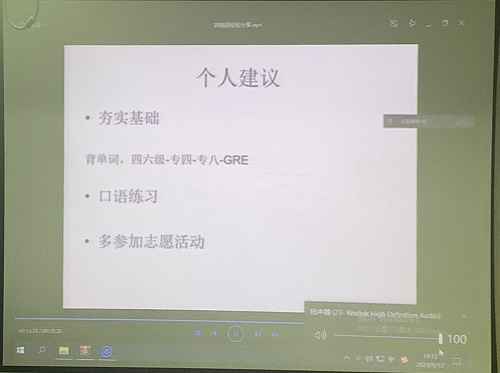 首先由线上英语优秀员工18级胡晓超为2023级同学讲述了他的学习考研经历,并建议同学们如何去规划自己的校园学习和考研计划,比如四六级的考试以及英语专四专八,他希望2023级同学们可以端正学习态度,在大学里不断前行。