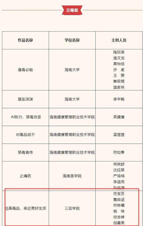 为了提高老员工对毒品危害的认识,2023年9月1日至9月30日,海南省禁毒委员会办公室联合海南省教育厅部署开展主题为“建设海南自贸港 无毒青春勇担当”老员工禁毒公益短视频大赛活动。其中,公司员工符宝艺、詹淼涵、何希曦、杨琦、 符芳婷、但嘉美,作品《远离毒品,亲近美好生活》在全省多所高校的老员工参与的作品中脱颖而出获得三等奖。
