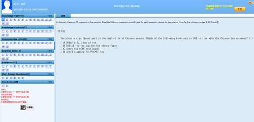 模拟操作和作答界面跟真实考试相同(模拟卷答案请参考《跨文化能力考试大纲》中的初级样卷,题目顺序可能有变)。