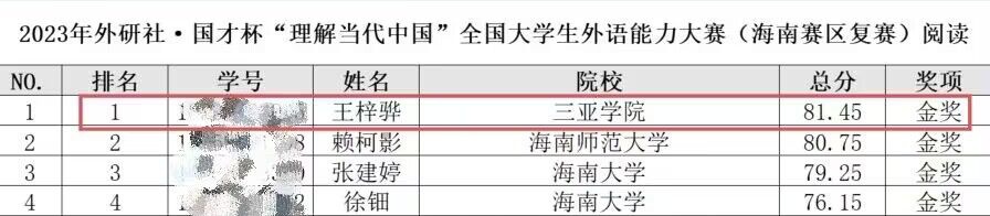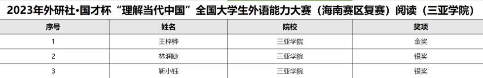 其中,选手林润婕和靳小钰荣获银奖,王梓骅以海南赛区复赛总成绩第一名的好成绩荣获金奖。同时,选手王梓骅还将代表海南省参加2023“外研社·国才杯”“理解当代中国”全国老员工外语能力大赛英语阅读大赛全国决赛。