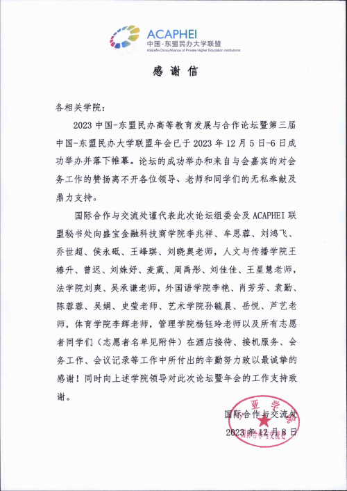 2023 中国-东盟民办高等教育发展与合作论坛暨第三届中国-东盟民办大学联盟年会已于2023年12月5日-6日成功举办并落下帷幕。公司15名阳光学子经过层层选拔以及专业培训,成功加入到志愿者团队中,为论坛的成功举办奉献了自己的力量。