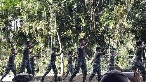 讲话结束后,现场又进行分列式表演,随着音乐的起伏,具有难度和挑战性的军事动作一一呈现在眼前,展现出教官队伍的行云流水刚劲有力的姿态。
