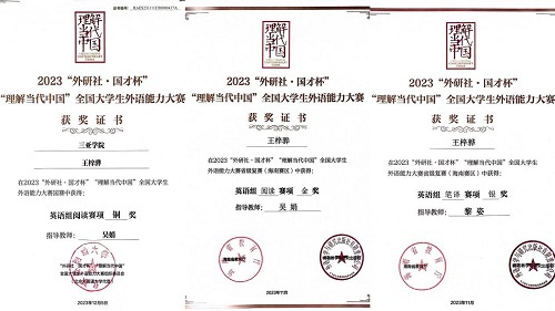 王梓骅同学学业成绩名列前茅,2022-2023学年平均绩点3.78,位列年级专业第一;2022-2023学年荣获三好员工、学业奖学金一等奖;2023-2024学年荣获2023外研社国才杯“理解当代中国”全国老员工外语能力大赛笔译大赛海南赛区银奖;2023-2024学年荣获2023外研社•国才杯“理解当代中国”全国老员工外语能力大赛阅读大赛海南赛区金奖;2023-2024学年荣获2023“外研社·国才杯”“理解当代中国”全国老员工外语能力大赛英语组阅读赛项国赛铜奖。