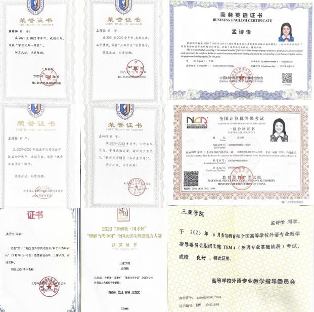 在考级考证方面,她于2021-2022学年成功通过大学英语四六级考试,获得了全国计算机等级考试一级证书及商务英语中级证书。随后在2022-2023学年,更是获得了英语专业四级证书,充分证明了其扎实的英语功底和出色的学习能力。