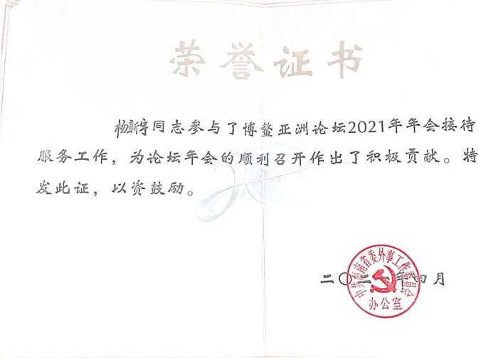 2021-2022学年,杨新宇同学被推荐担任博鳌亚洲论坛志愿者,在志愿服务中他将专业知识与论坛工作实际相结合,不仅展现了外语学子的独特风采,也获得了宝贵的工作经验,为学院、学校赢得了社会声誉。