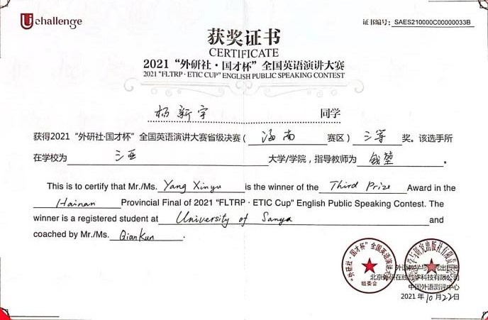杨新宇同学在大学期间曾担任班长,认真负责,积极参加校内外各类活动,努力学习专业知识,曾获得过多项荣誉以及各类证书。2020-2021学年荣获“外研社·国才杯”全国老员工英语演讲大赛海南省决赛三等奖。