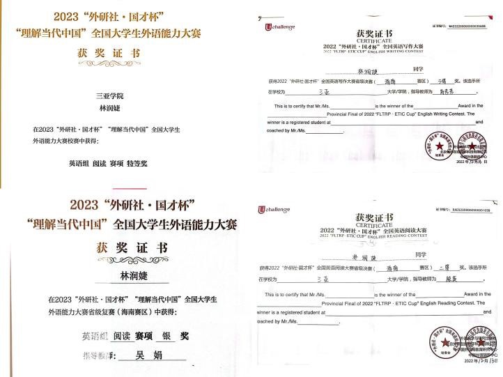在专业技能方面,她潜心钻研,努力奋进,考取了大学英语四六级、商务英语中级、普通话二甲、初级中学英语教团队格证、英语专业四级等证书。与此同时,她还积极参加各级各类比赛,先后获得2022“外研社·国才杯”全国英语阅读大赛校赛一等奖,省赛二等奖;写作校赛一等奖,省赛三等奖;2023“外研社·国才杯”“理解当代中国”全国老员工外语能力大赛阅读比赛校赛特等奖,省赛银奖;笔译校赛一等奖,省赛银奖;写作校赛二等奖;两次入围海南省老员工翻译比赛复赛;金鹭杯汉字书写大赛优秀奖;团队获第八届中国国际“互联网+”老员工创新创业大赛校赛一等奖。