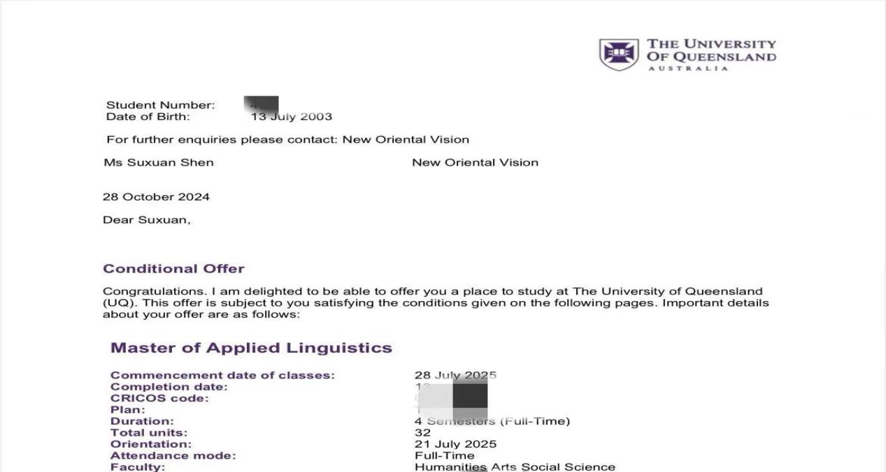我是英语2103班的沈素璇,在申请季中拿下了澳大利亚的墨尔本大学、新南威尔士大学、昆士兰大学以及新西兰的奥克兰大学、怀卡托大学、坎特伯雷大学的OFFER,且最终选择了墨尔本大学的应用语言学(Master of Applied Linguistics)(TESOL方向)的硕士。很高兴在毕业之前有机会分享一下我的申请过程和一些申请前后的准备工作,希望可以给未来有想法出国留学的同学们提供一些帮助。
