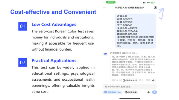 另一组员工用DeepSeek分析四季色彩理论,上传自己的照片,让AI智能推荐适合不同商务场合的妆容、发色和穿搭。例如:秋季型员工:AI建议暖调大地色眼影+砖红色唇妆,搭配驼色西装;冬季型员工:推荐冷调深色套装+银饰,增强专业感。