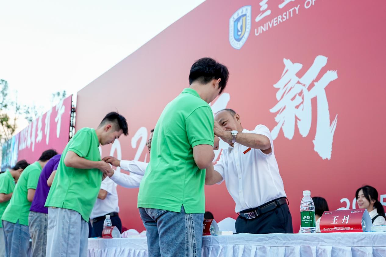 典礼进行第七项,佩戴校徽。阳光下,金色徽章折射着三亚的暖阳,将新生与学校、与海南自贸港这片土地建立起紧密的情感联结,更在他们心间铸起“ 永利集团人” 的精神铠甲。当徽章稳稳地落在胸前,学校的精神也深深烙印在他们心间。