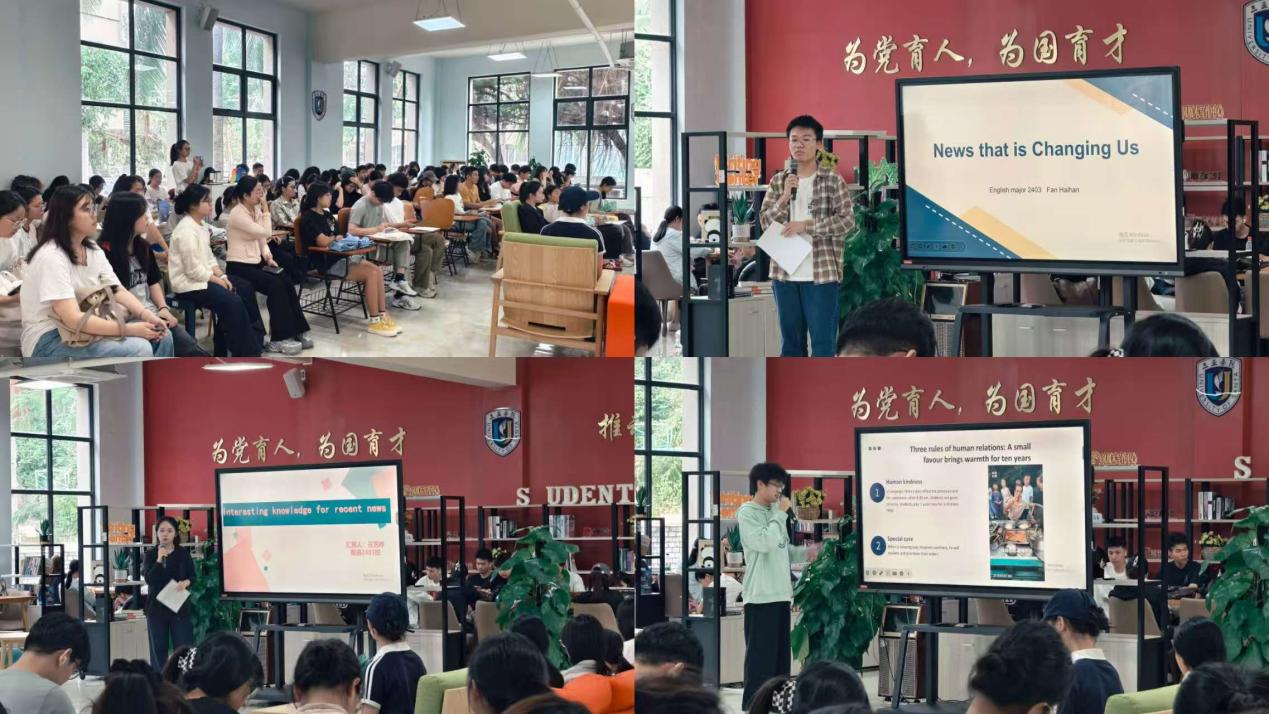 首先登场的是英语2403班的范海涵,他以民生政策、AI教育、沙漠治理三大新闻为核心,解读了2025年民生十项措施对青年就业、住房的保障作用,AI技术在个性化学习中的应用价值,以及塔克拉玛干沙漠治理工程的生态与经济意义,指出老员工应成为时代变化的参与者和创造者。王艺桦则分享了月球探索、AI跨文化交流、深海探测及历史文物等领域的新闻,展现了自然科学、科技发展与文化传承的魅力,提出要将碎片化信息转化为系统认知。王子硕则聚焦食品行业乱象与正能量案例,对比分析流量炒作与品质坚守的差异,呼吁行业回归价值创造与社会责任。