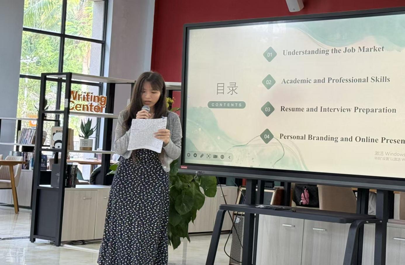 2025年10月23日16:00,永利集团东区书海馆员工中心学业大厅内气氛热烈,一场别开生面Freetalk活动,主题 “Presentation Show-useful knowledge for job preparation”演讲活动在此精彩上演。学业导师付鹃老师精心统筹,来自英语2402班的李伊萱、王明缘、李上冰、刘可心四位同学轮番登场,结合PPT进行了关于就业准备的英语演讲,为同学们带来了一场知识与智慧的盛宴。